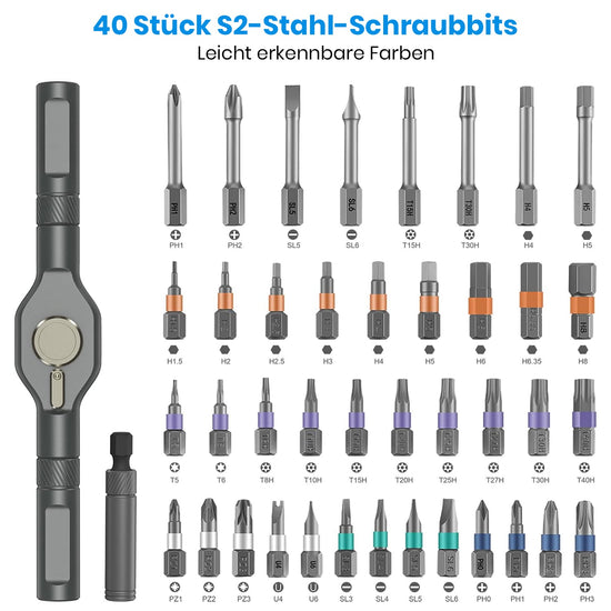 • Umfassendes 42-teiliges Set: Ausgestattet mit 42 austauschbaren magnetischen Bits, enthält dieses Set alle wesentlichen Typen wie Schlitz, Kreuzschlitz, Torx, Sechskant und mehr. Perfekt geeignet für die Arbeit an Elektronik, Haushaltsgeräten, Möbelmontage und anderen kleinen Projekten, stellt es sicher, dass Sie immer das richtige Werkzeug für jede Aufgabe haben.