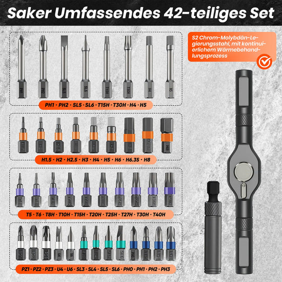 • Langlebige und robuste Konstruktion: Hergestellt aus hochwertigem, korrosionsbeständigem Stahl, sind die Bits und der Schraubendrehergriff darauf ausgelegt, häufigem Gebrauch standzuhalten, und gewährleisten eine lange Lebensdauer und dauerhafte Leistung. Sie können sich auf das Saker 42-in-1 Magnet-Schraubendreher-Set sowohl für leichte als auch für schwere Anwendungen verlassen.