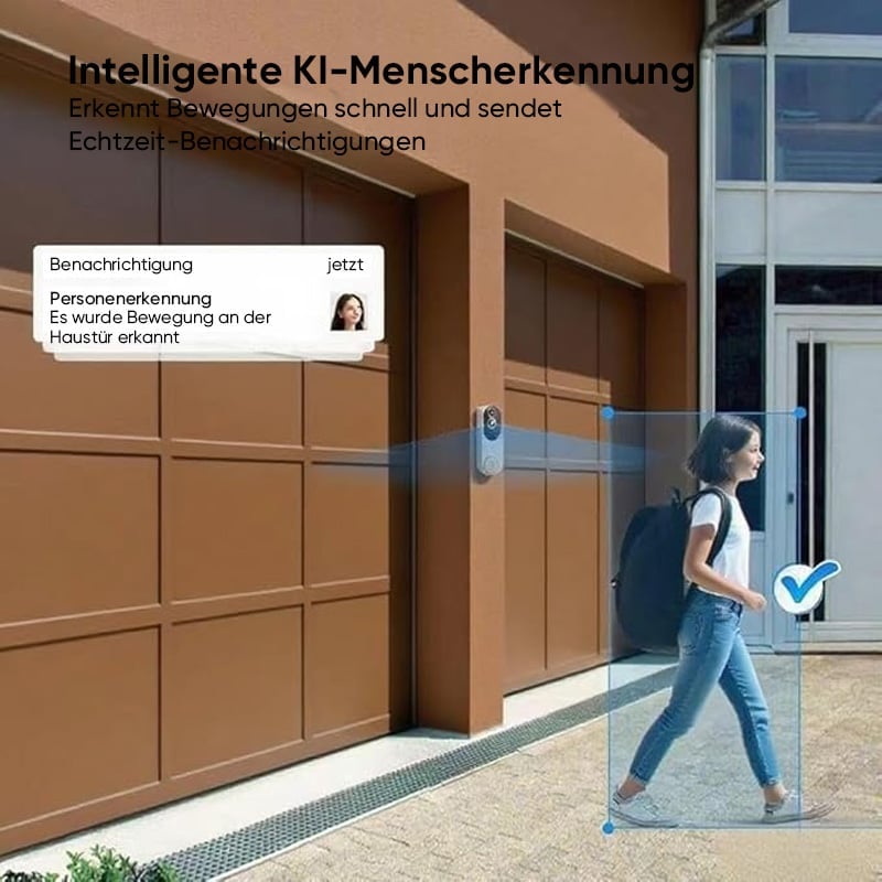 KI-Erkennung & Zwei-Wege-Kommunikation: Ausgestattet mit KI-Bewegungserkennung, die menschliche Bewegungen sofort erkennt und Benachrichtigungen sendet. Die kabellose Video-Türklingel bietet zudem eine Echtzeit-Zwei-Wege-Kommunikation, die die Kommunikation mit Besuchern einfach und bequem macht.
