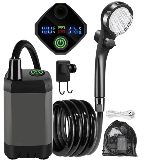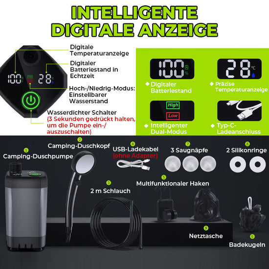 • 【Modernes LED-Display】 Unsere tragbare Campingdusche verfügt über ein verbessertes LED-Display, das den Ladezustand und die Wassertemperatur deutlich anzeigt. Bei Temperaturen von ca. 32–60 °C vermeiden Sie Verbrennungen und Stromausfälle bei Ihrem Outdoor-Abenteuer.