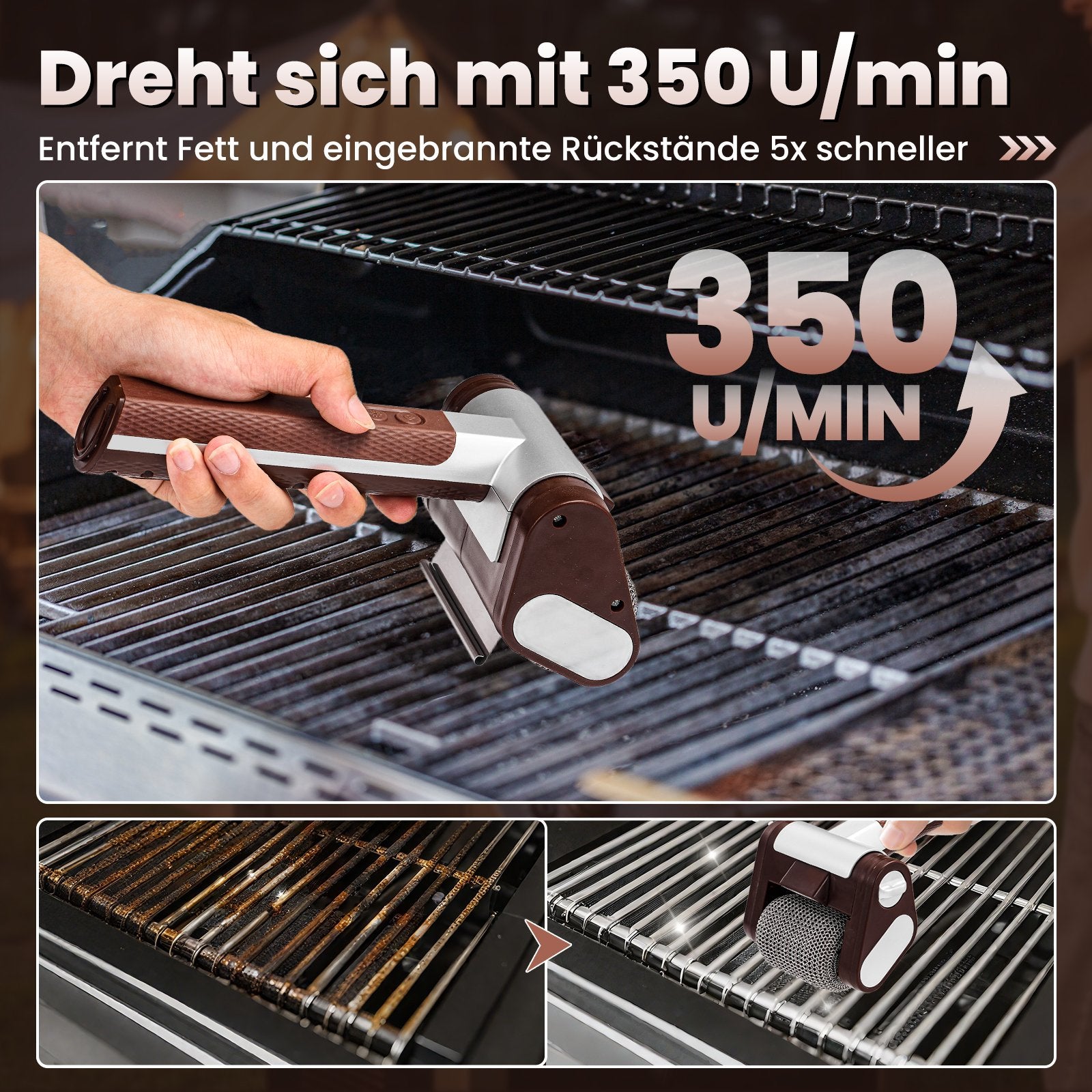 Kabellose Power mit 350 U/min: Entfernen Sie eingebrannte Rückstände im Handumdrehen. Die Walze aus rostfreiem Edelstahl (Typ 304) dreht sich mit 350 U/min – ganz ohne Kraftaufwand. Einfach den Grill vorheizen und loslegen.
