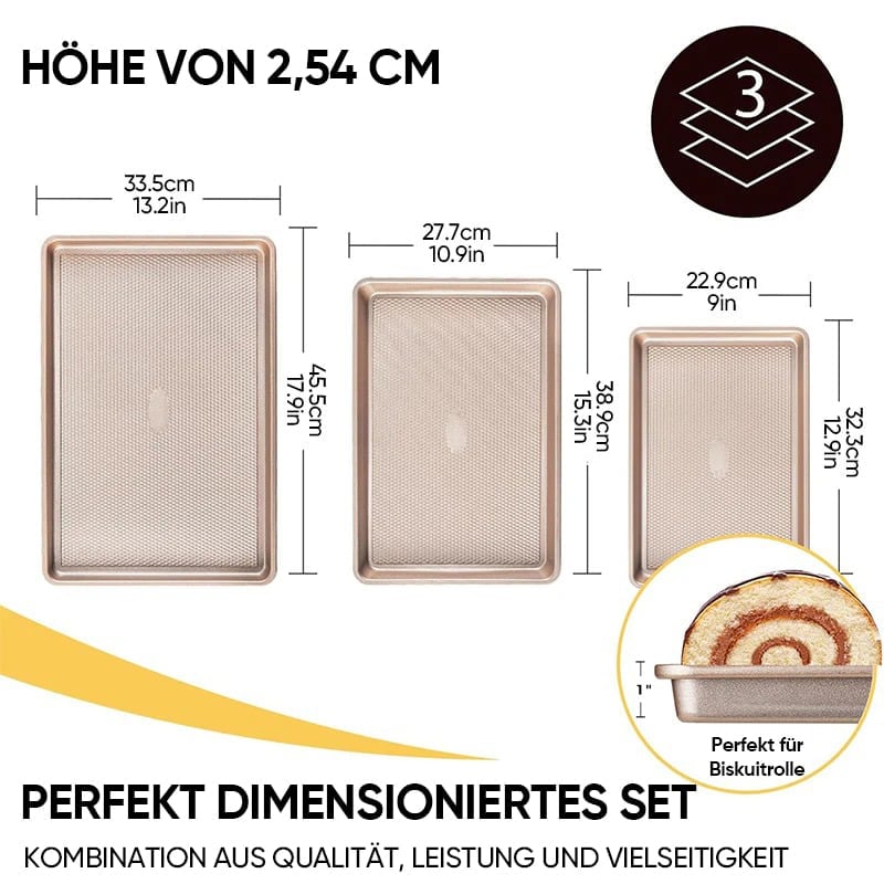 • Alles exklusiv im Set: Dieses Backblech-Set enthält 3 antihaftbeschichtete Backbleche. Sie haben genau die richtige Größe – klein zum Backen von Keksen, Gebäck und Lasagne, mittelgroß für Biskuitrollen und groß für Hähnchen und Gemüse. Mit nur einem Set können Sie mühelos Ihren täglichen Backbedarf decken und Ihr Backen auf das nächste Level bringen.