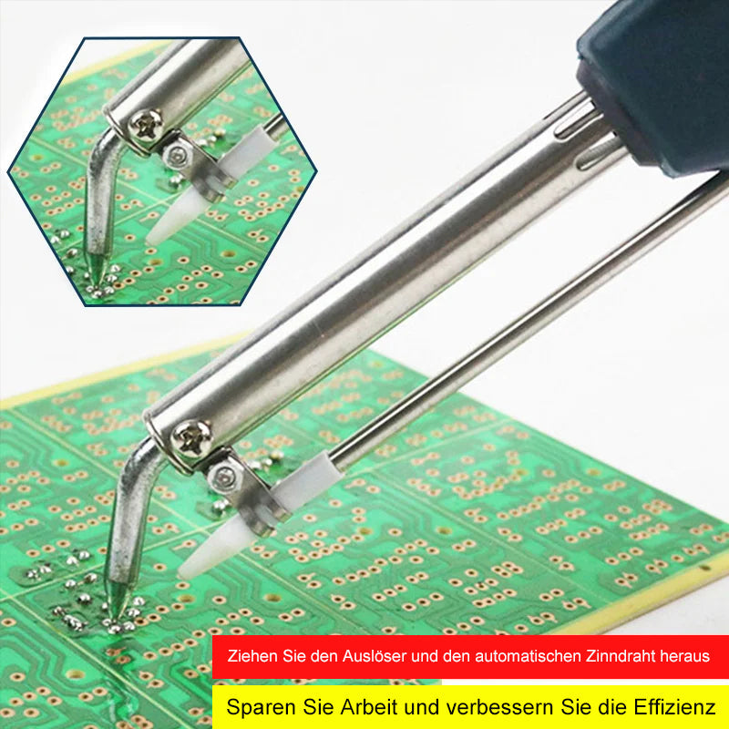 Sie müssen nur die Zinnspule auf der Halterung fixieren, den Auslöser leicht drücken, und der Zinndraht fließt automatisch zu dem Ort, an dem Sie Löten benötigen.
