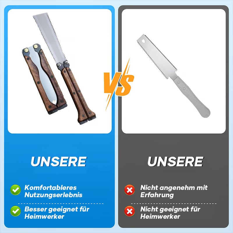 - Beidseitige Schärfe: Die tragbare, faltbare doppelseitige Säge SAKER® verfügt über Sägeblätter aus SK85-Stahl mit beidseitiger Schärfung für effizientes Schneiden. Sein zweischneidiges Design reduziert den Kraftaufwand und sorgt für Vielseitigkeit sowohl bei trockenem als auch bei nassem Holz, sodass es für verschiedene Holzbearbeitungsaufgaben geeignet ist.